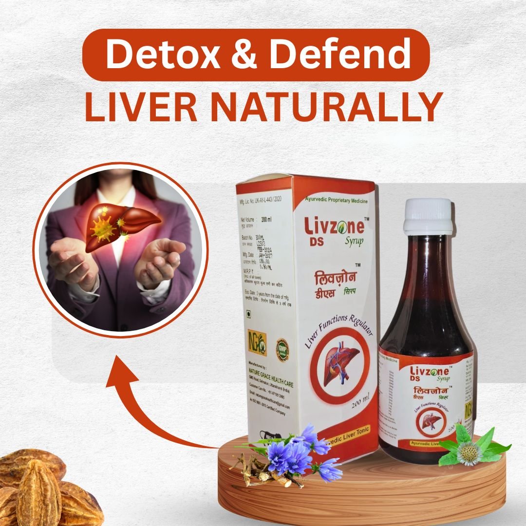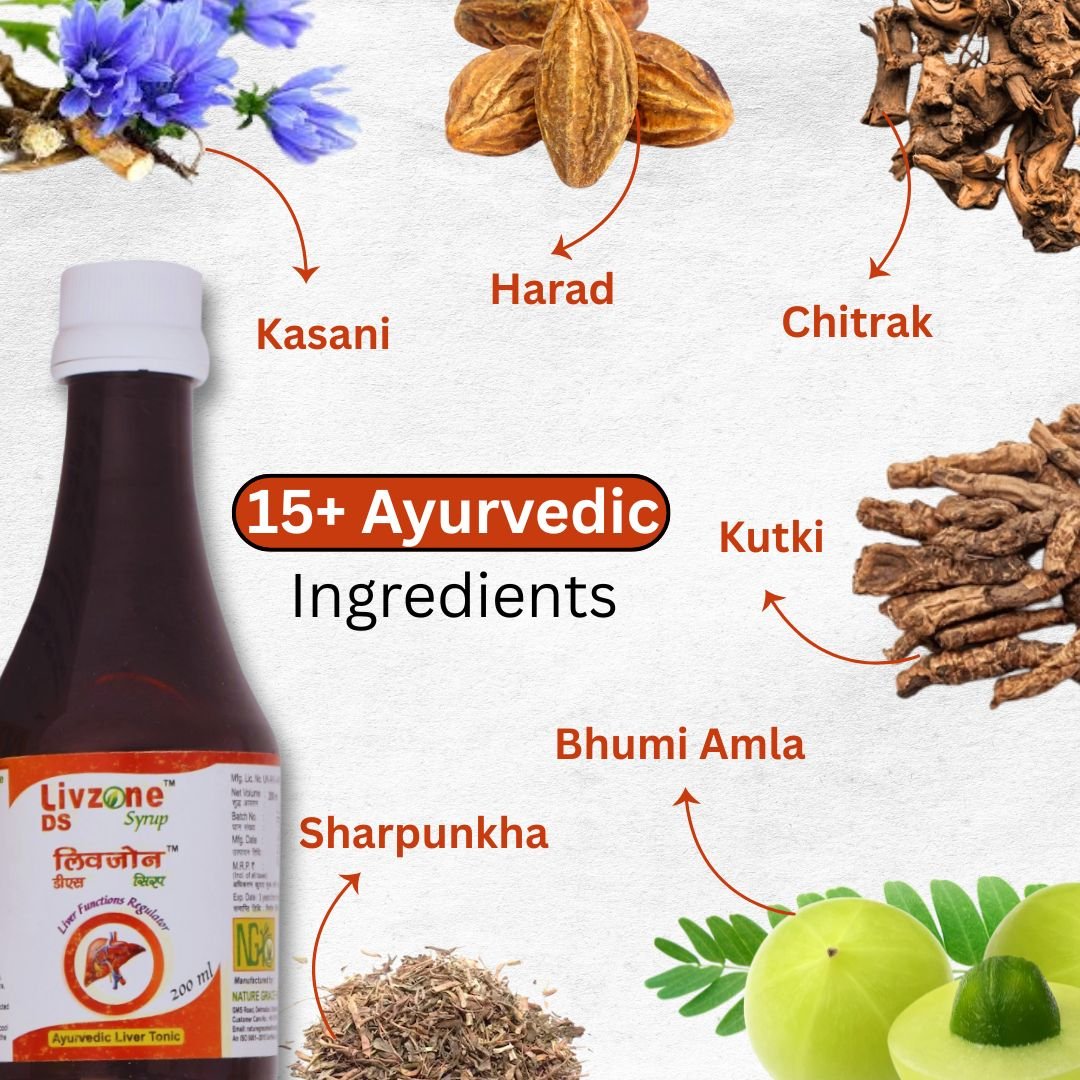 Nature Grace Health Care’s Livzone DS Syrup is a herbal formulation designed to promote liver health and detoxification. This syrup is enriched with 15 potent Ayurvedic ingredients, such as: