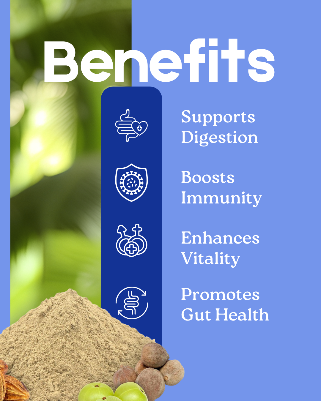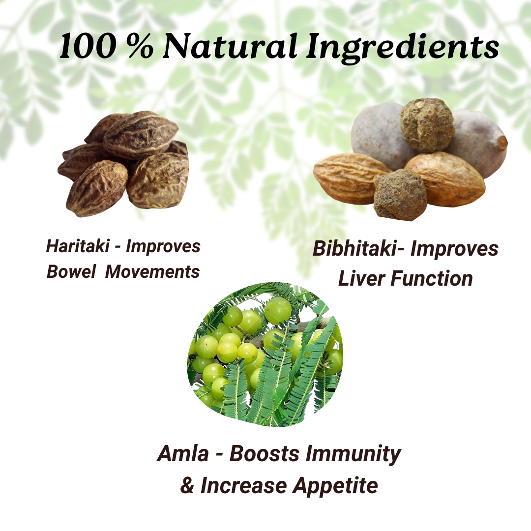 Haritaki (Terminalia chebula): Supports healthy bowel movement and digestion.